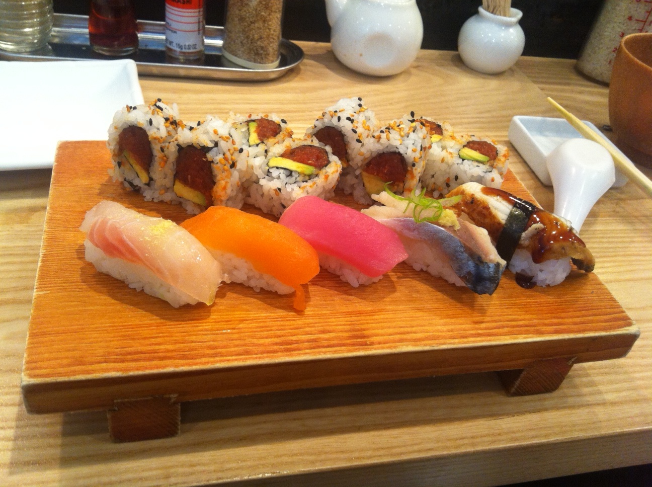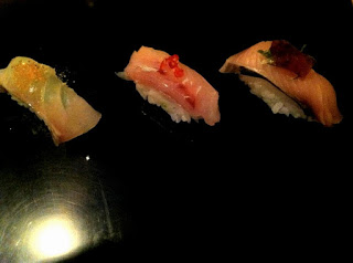 They fly in fish from the Tsujaki market weekly. Last week I stopped in and had one if their specials form the market, Tsujaki nigiri. These delicate pieces of madai, baby yellow tail and bonito are carefully paired with ingredients such as mint and tobiko creating explosive flavors.