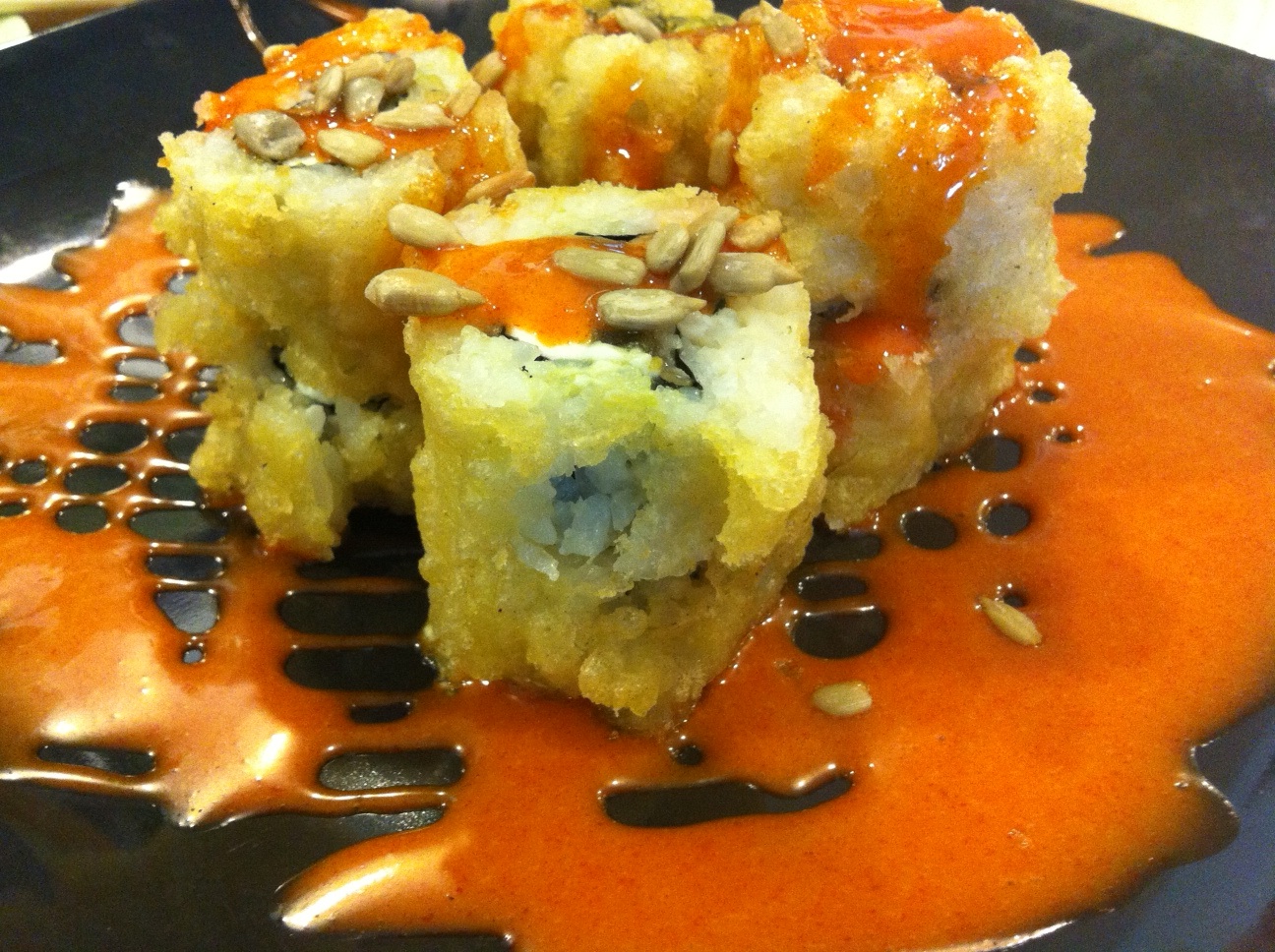 Midnight Sun is the perfect option for those who prefer their fish smoked or cooked. The midnight sun has a wonderful contrast of flavor with smoked salmon, complimented with cream cheese, creamy avocado, candied jalapeno topped with sunflower seeds and their tempera sauce.