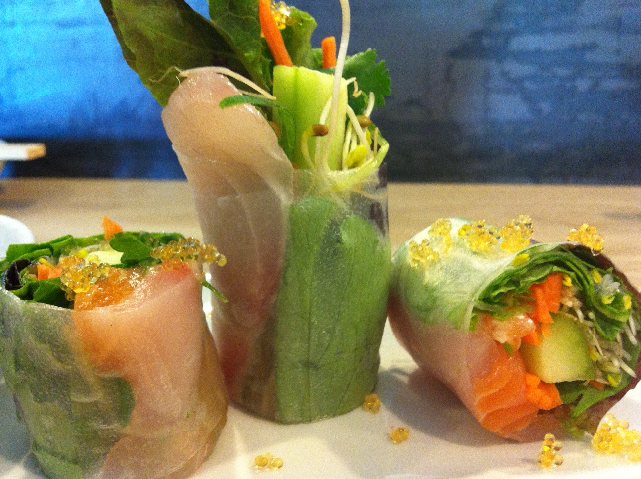 At dinner time they serve a variety of Izakaya style dishes such as yaki-onigiri (grilled rice balls), takoyaki (octopus dumplings) and Kome viche (ceviche made with madai, salmon and mango). Three of my favorite rolls at Kome are the Endo in New York, Love for Sale and Midnight Sun. Endo in New York is a healthy sashimi spring roll with fresh sea bass and salmon sashimi, tobiko cucumber, carrots a hint of cilantro served with a Thai chili sauce.