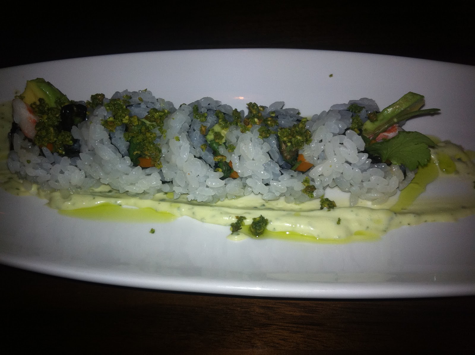 The Shishito maki is a surprising twist on a crab roll. The maki is filled with succulent crab, yama gobi, cilantro, wrapped in nori and topped with shishito peppers.