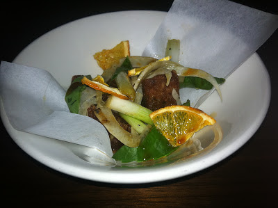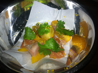 Escolar usually does not look appealing when photographed however this is not the case at Uchi. The walu walu is oak-grilled escolar, candied citrus, yuzupon and myoga.
