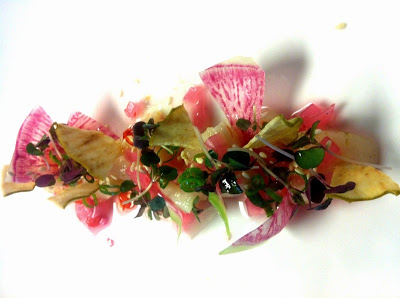 In addition to the impressive social hour Chef Thai and Chef Eck recently introduced several exciting new dishes: hokkaido scallops, tuna with lychee, spring lamb and hoi tod crepe. Hokkaido scallops is a gorgeous dish of raw scallops, microgreens, garnished with watermelon radish, crisp green apple chips, topped with Thai chili vinaigrette, white truffle oil and sesame seeds.