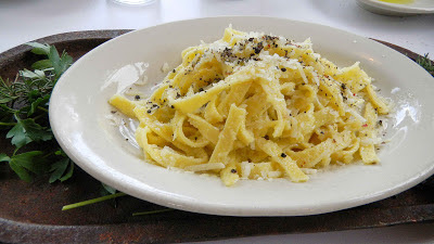 Cacio E Pepe has a wonderful mix of Grana Padano & Pecorino cheeses, black pepper and olive oil. The Grana Padano lends a grainy texture and tang to the dish while the Pecorino offers a buttery note.