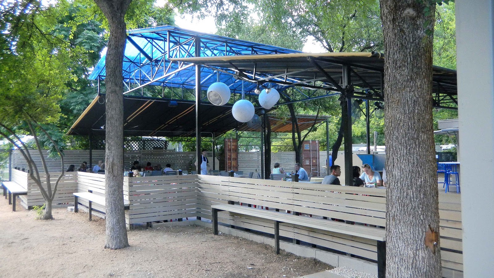 The large outdoor patio is partially covered and has an outdoor bar, both essential during the sweltering Texas summer.