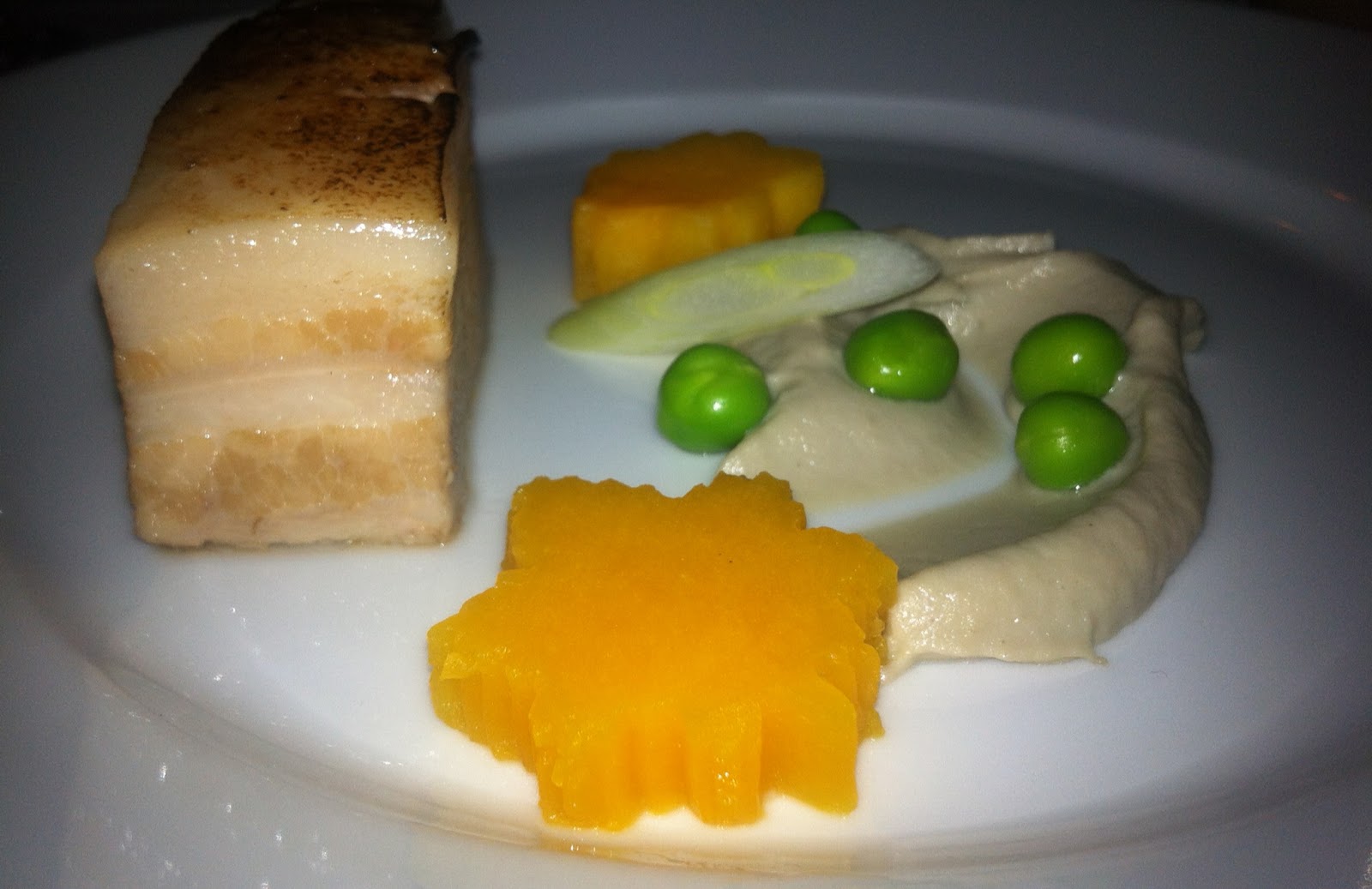 Rich pork belly plated with creamy miso eggplant and butternut squash