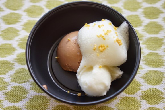 Chef Speer\’s pana cotta sherbet with apple bubbles