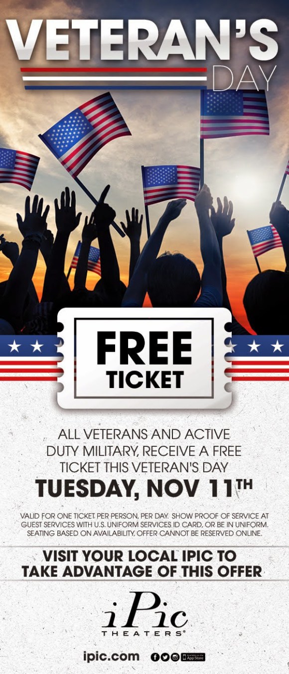 Want to catch a movie in style on Veterans Day? iPic Theaters is the way to go! iPic is offering a free movie ticket to all veterans and active duty military.