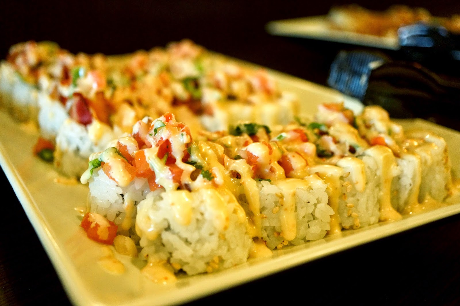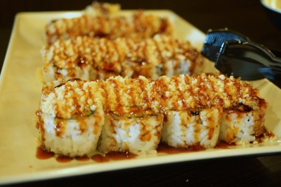 The richly flavored Great Atlantic roll has oven-baked salmon topped with a crunchy tempura and drizzled with a teryaki sauce that I found to taste similar to eel sauce.