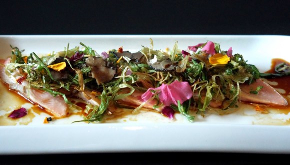 During their anniversary guests were treated to a complimentary glass of saké and some new menu offerings. All the special dishes looked delicious but most intriguing to me was the truffle salmon. The dish has tender cuts of buttery rich salmon topped with crispy shallots and scallions, edible flowers in a light ponzu sauce.