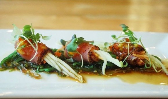 After two visits I have quickly become a fan of their happy hour. Happy hour is offered Monday-Saturday from 5pm-7pm, reverse happy hour 8:30pm-10pm and all day on Sundays. I have tried a variety of items from their cold appetizer and sushi sections of the happy hour. The ruby tuna is a splendid mix of seared peppered tuna wrapped cucumber and crab salad topped with mango sauce on a bed of ponzu and seaweed salad.