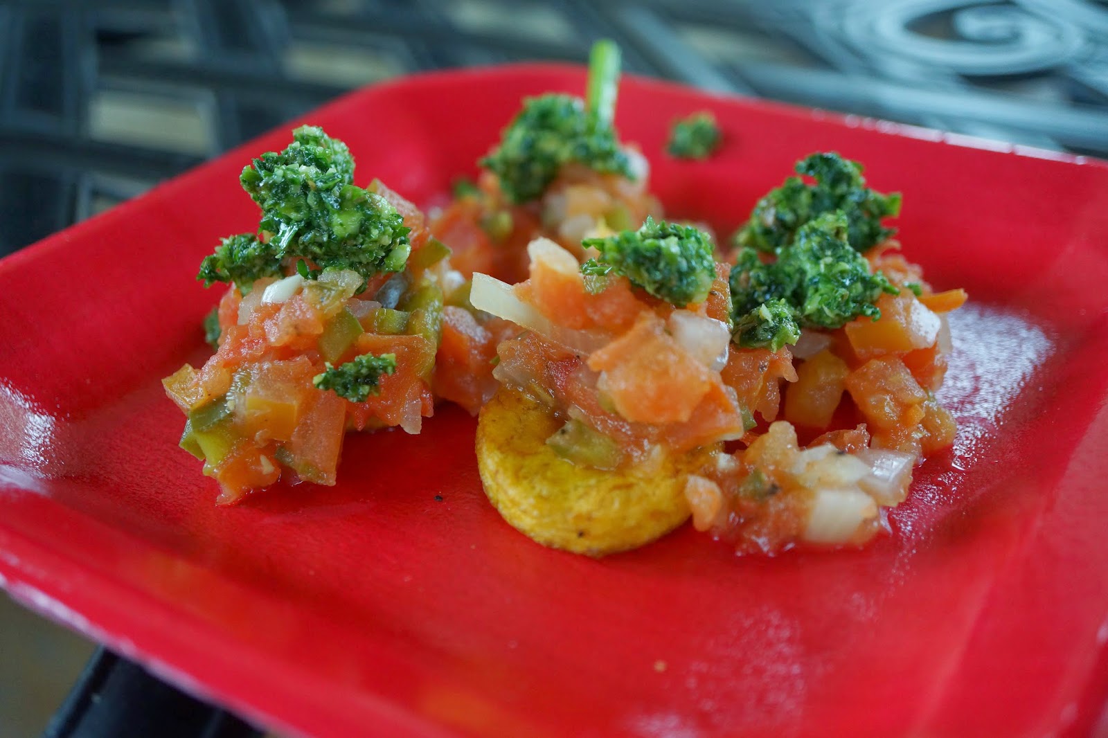 Patacones con hogoa is a Columbian specialty. The dish is simple yet delicious and is often served as a snack or appetizer. The Bandwagon TX version has fried plantains topped with a warm tomato chutney.