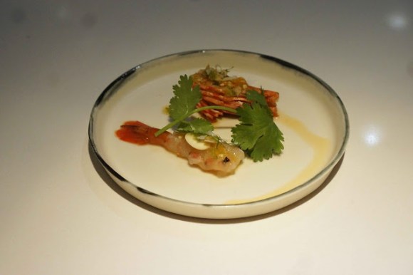 The first dish set the tone for the culinary experience. Kung cha nampla was a \”fire and ice\” if you will with hot and cold spot prawn served with nam jim (dipping sauce).