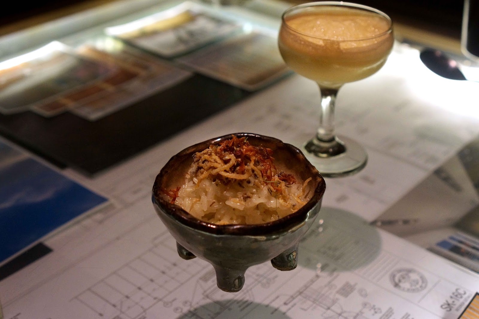 For dessert we were treated to khao niao nah pla hang. This interesting dessert has rhum agricole, bigallet china china, coconut cream and lemon grass brown sugar.