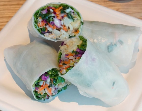 The veggie wrap tempura cauliflower was a crowd pleaser! The wrap has lightly tempura fried cauliflower rolled in a rice paper wrap with a splendid mix of lettuce, kale slaw and fresh herb mix. The Thai chili sauce goes beautifully with this wrap.