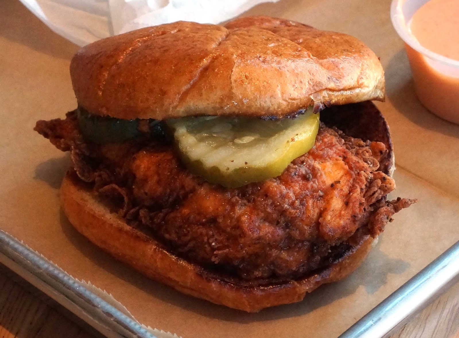 The Standard with a crispy chicken breast served on toasted whole wheat bun with homemade pickle chips and your choice of sauce. We opted for the tasty house-made Sriracha mayo.