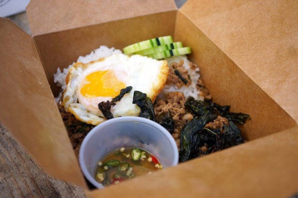 The Pad Kapow is the ultimate hangover food served in a hardy portion of incredibly flavorful stir fried pork, Thai basil with a side of delightful aromatic jasmine rice, slices of cold cucumber and topped proper with a fried egg.