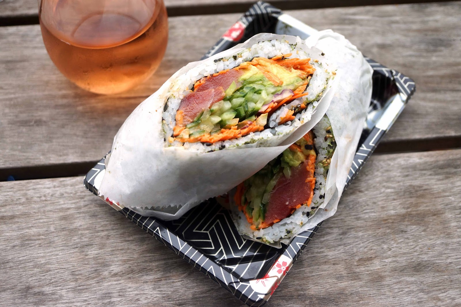 I ordered the Tuna Burrito with sushi grade tuna, shredded carrot, cucumber, creamy avocado, crunchy red cabbage, nori komi, a hint of \”spicy sauce\” wrapped in perfectly cooked rice and seaweed. I paired this delicious sushi burrito with a refreshing rose wine from the Draft Shack making for my definition of the perfect meal. What is the verdict? The Whole Foods Market Sushi Burrito is a generous portion menu item that is chock full of fresh quality ingredients, I loved it! It is fun to eat and I could barely finish the delectable sushi goodness. Portion wise, the burrito would easily equal the size of 2-3 maki rolls making it reasonably priced ranging from $8.99 – $10.99.