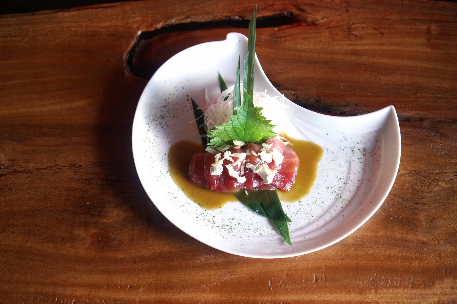 The Maguro Green Tea has delicate cuts of tuna sashimi topped with a green tea matcha sauce, macadamia and creamy goat cheese. The flavor profile of this sashimi dish is phenomenal.