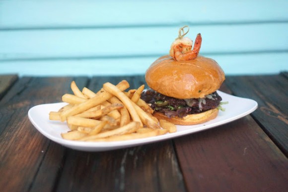 That Shrimp Chorizo Burger is a fun take on a Cajun style burger complete with skewered shrimp to hold the goodness together.