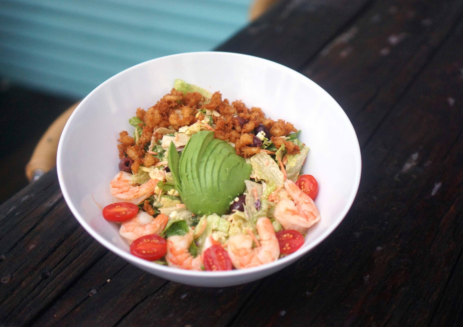 The generously portioned Shrimp Crab Avocado Salad served with choice of fresh or tempura fried crab is my ideal meal. There are lots of fresh veggies and lean protein in this seemingly bottomless bowl.