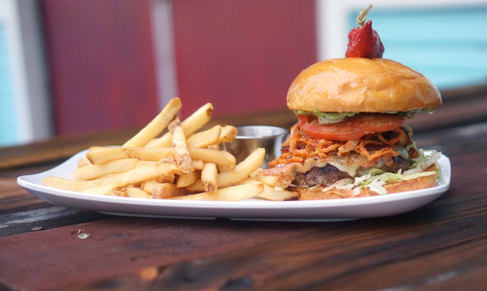 That Shrimp Chorizo Burger is a fun take on a Cajun style burger complete with skewered shrimp to hold the goodness together.