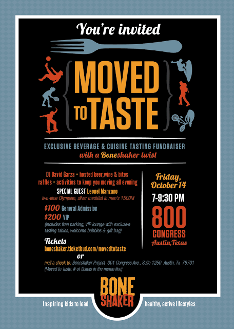 Hello friends! I am an event chair for an upcoming tasting fundraiser, Moved to Taste benefiting Boneshaker Project. Their mission is to inspire kids and families to lead active, healthy lifestyles. Please join me in supporting this important cause by attending Moved To Taste. This must-not-miss event takes place Friday, October 15, 2016 from 7:00 pm-9:30 pm at 800 Congress. Guests may enjoy culinary and beverage tastings from Hai Hospitality, Olive and June, Delicious, Blenders and Bowls, True Food Kitchen, Oasthouse Kitchen and Bar, Trace, be one of the firsts to try Cannon and Belle, Jaime’s Spanish Village, The Honest Bar and more! Jams from the local spin guru DJ David Garza. Hosted sips from Live Beverages, Whisler’s, SWAY Water, South Austin Brewery, Cavalino Tequila, Dripping Springs Vodka, The Grove Wine Bar and Kitchen, and more. Activities and demos to inspire movement from Kor180, PURE Austin, Wanderlust Yoga, The Lab, LOVE Cycling, City Surf Fitness and more! Special guest includes 2 time Olympian, Leo the Lion Manzano. There will be exciting $5 raffles all night long.