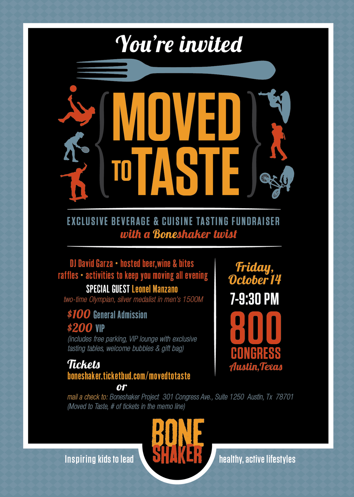 Hello friends! I am an event chair for an upcoming tasting fundraiser, Moved to Taste benefiting Boneshaker Project. Their mission is to inspire kids and families to lead active, healthy lifestyles. Please join me in supporting this important cause by attending Moved To Taste. This must-not-miss event takes place Friday, October 15, 2016 from 7:00 pm-9:30 pm at 800 Congress. Guests may enjoy culinary and beverage tastings from Hai Hospitality, Olive and June, Delicious, Blenders and Bowls, True Food Kitchen, Oasthouse Kitchen and Bar, Trace, be one of the firsts to try Cannon and Belle, Jaime’s Spanish Village, The Honest Bar and more! Jams from the local spin guru DJ David Garza. Hosted sips from Live Beverages, Whisler’s, SWAY Water, South Austin Brewery, Cavalino Tequila, Dripping Springs Vodka, The Grove Wine Bar and Kitchen, and more. Activities and demos to inspire movement from Kor180, PURE Austin, Wanderlust Yoga, The Lab, LOVE Cycling, City Surf Fitness and more! Special guest includes 2 time Olympian, Leo the Lion Manzano. There will be exciting $5 raffles all night long.