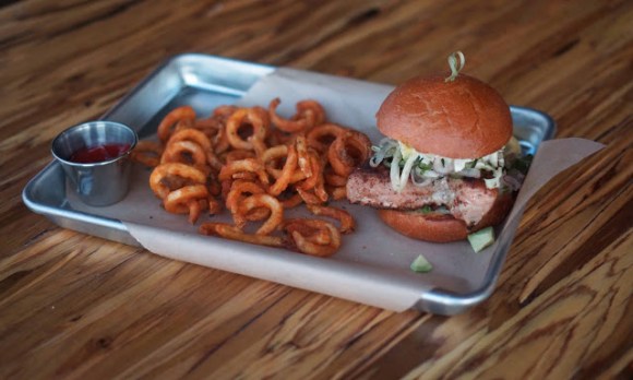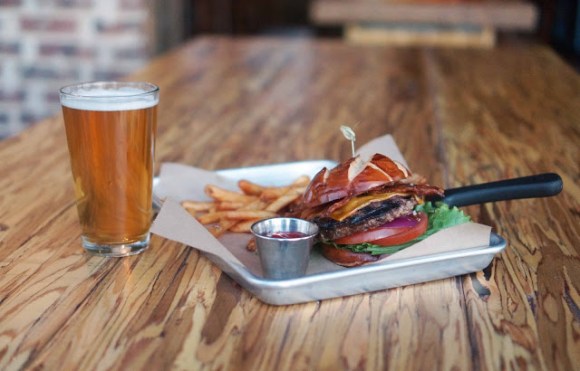 The hearty Bacon and Cheddar Burger is served on a delicious pretzel bun and has crisp lettuce, slices of tomato, onions served with  choice of regular or curly fries. Guests may also add an egg for $1.50.