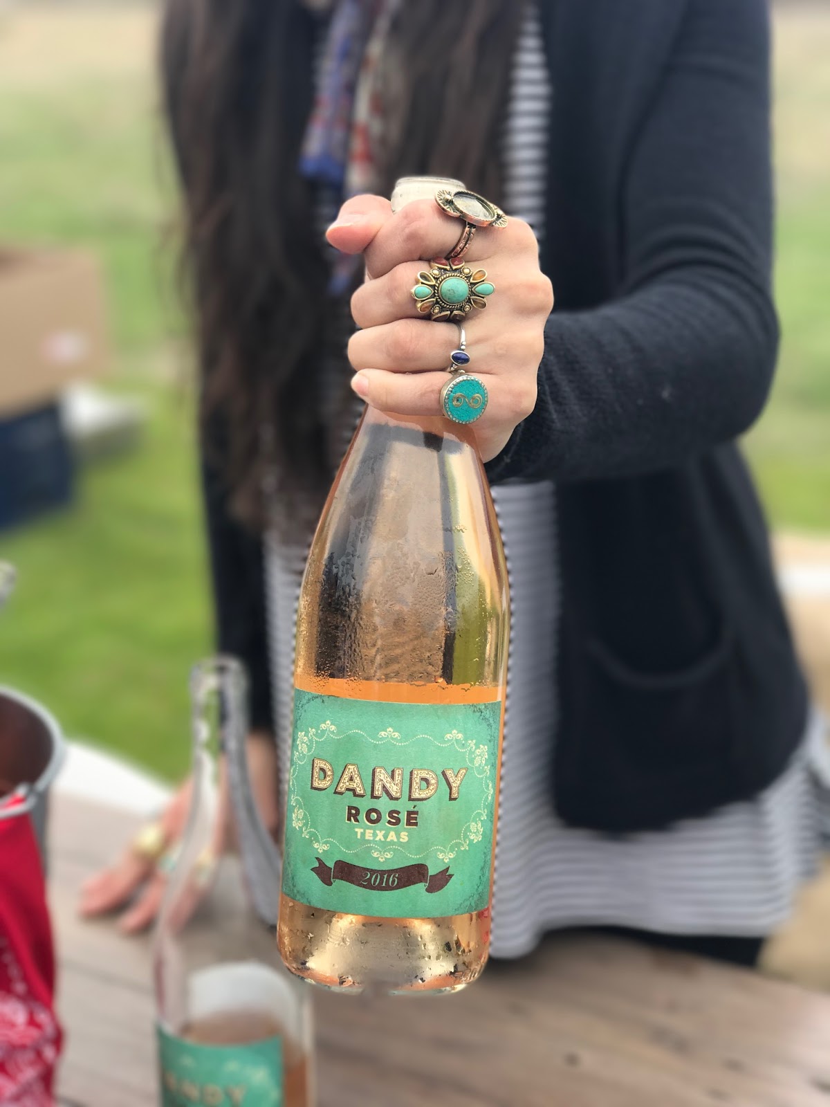 Dandy Rosé is made with100 percent Texas fruit, Dandy Rosé and is described as \”Lush. Balanced. Youthful. Fun. Dandy Rosé is Austin’s wine.\”