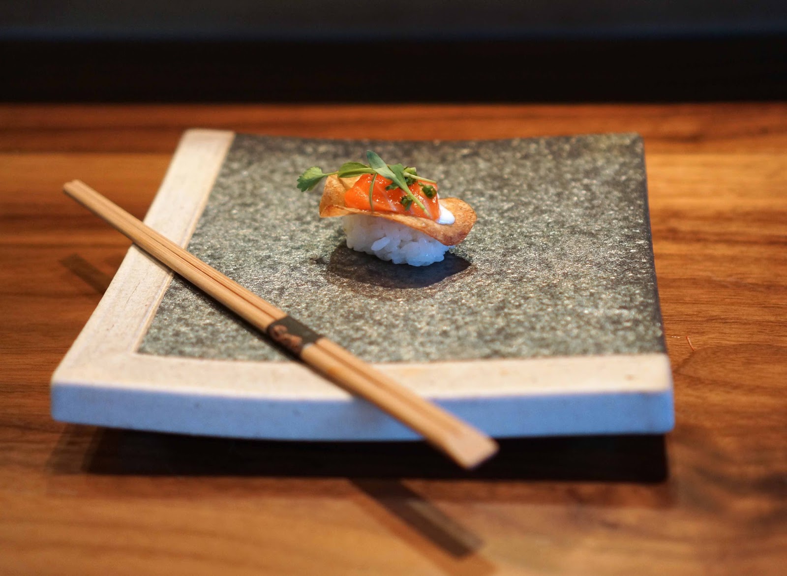 The Salmon Toro nigiri on top of house-made potato chip with a refreshing lemon wasabi and micro cilantro is a fun playful bite.