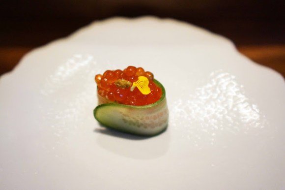 The stunning Ikura nigiri is served on a bed of torched hamachi wrapped snuggly in kyuri (Japanese cucumber) topped with a hint of wasabi.