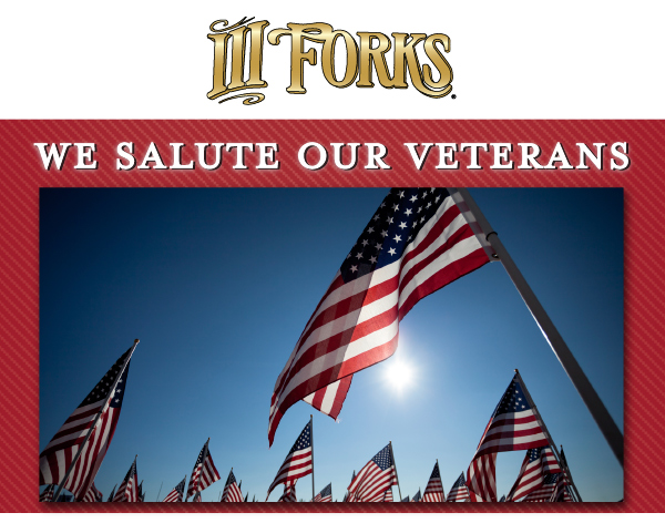 III Forks is one of my favorite places to visit to celebrate Veterans Day! They offer veterans and active duty military a complimentary entree up to $40 with proof of military service. I recommend arriving early to enjoy happy hour priced cocktails and the fillet mignon never disappoints. Reservations are recommended.