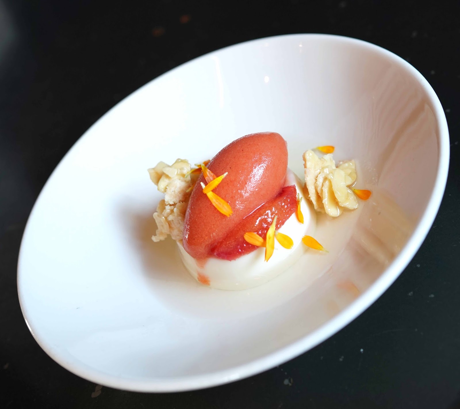 The ravishing blood orange Panna Cotta is a must try! The dessert has smoked cardamom, blood orange, starfruit & almonds.