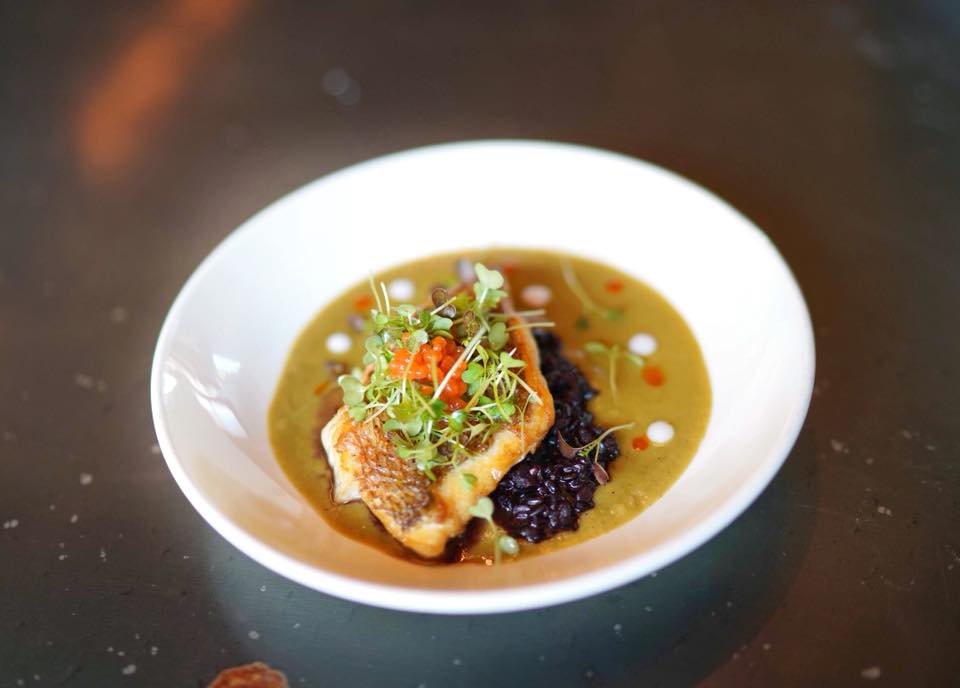 We are enamored by the perfectly prepared Pla Kaphng which is a gorgeous dish of red snapper, brightly flavored charred tomatillo green curry, topped with keta roe, heirloom carrot and a lovely forbidden black rice sofrito.