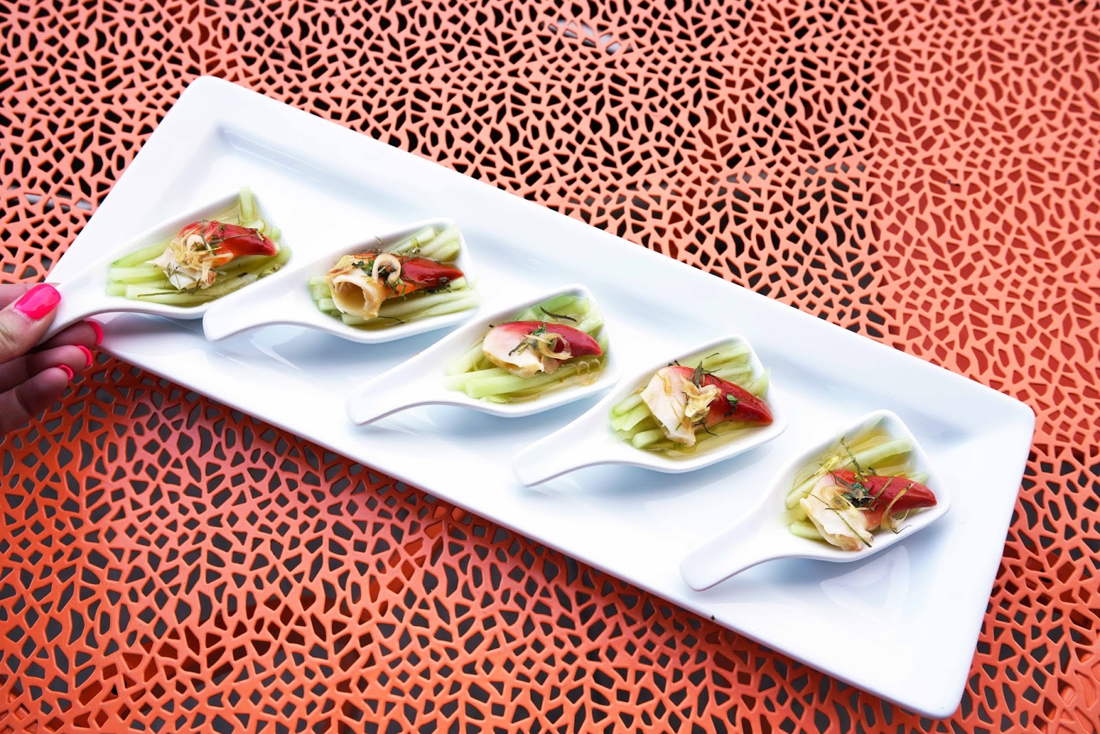Mandala\’s Surf Clam Ceviche in a brightly flavored lime juice, house special sauce, kaffir lime leaves, ginger, lemongrass, red onion and cilantro.