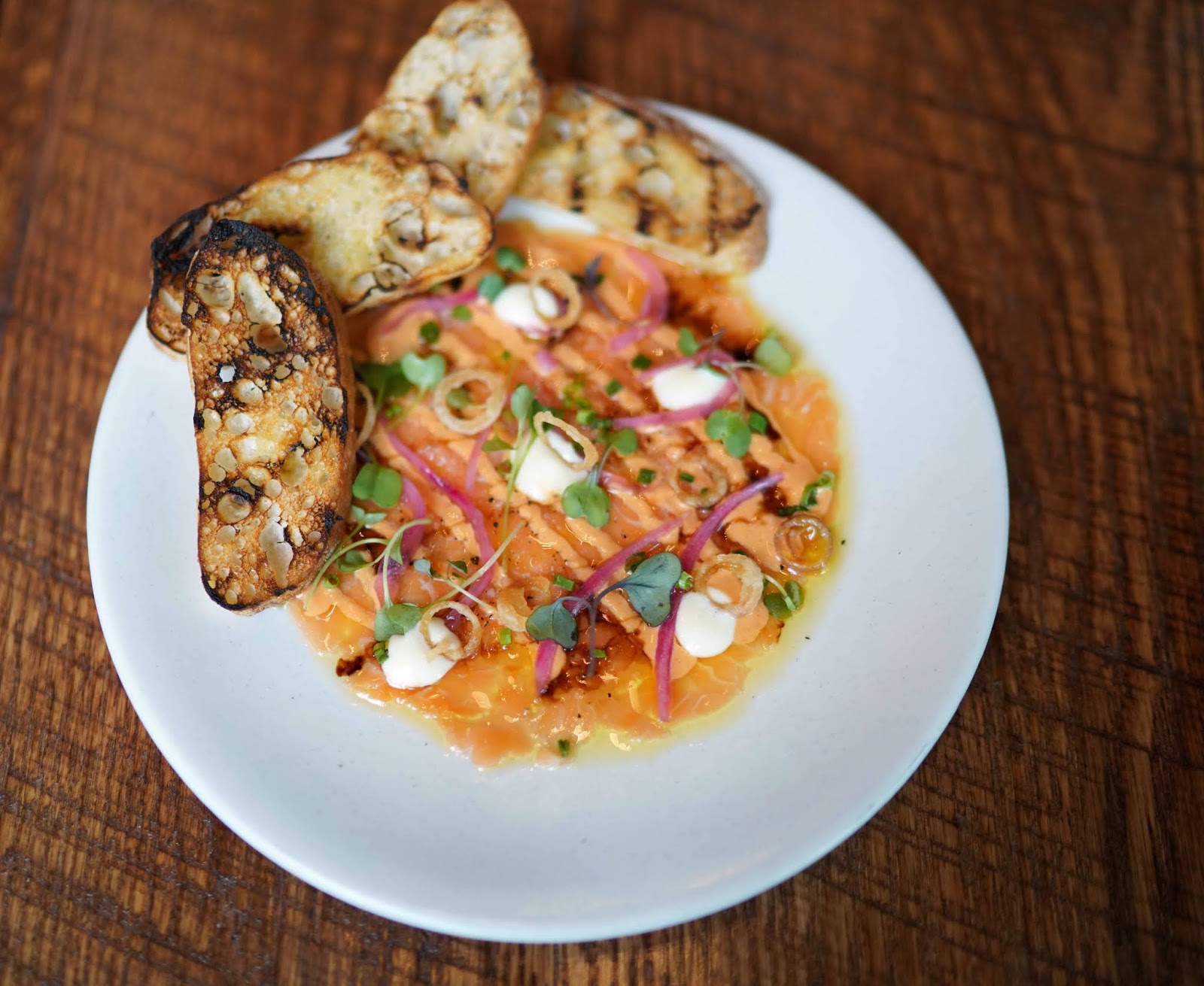 The vibrant salmon Carpaccio is a fun dish with delicate cuts of salmon with a little spice from the aioli and served with toasted bread.
