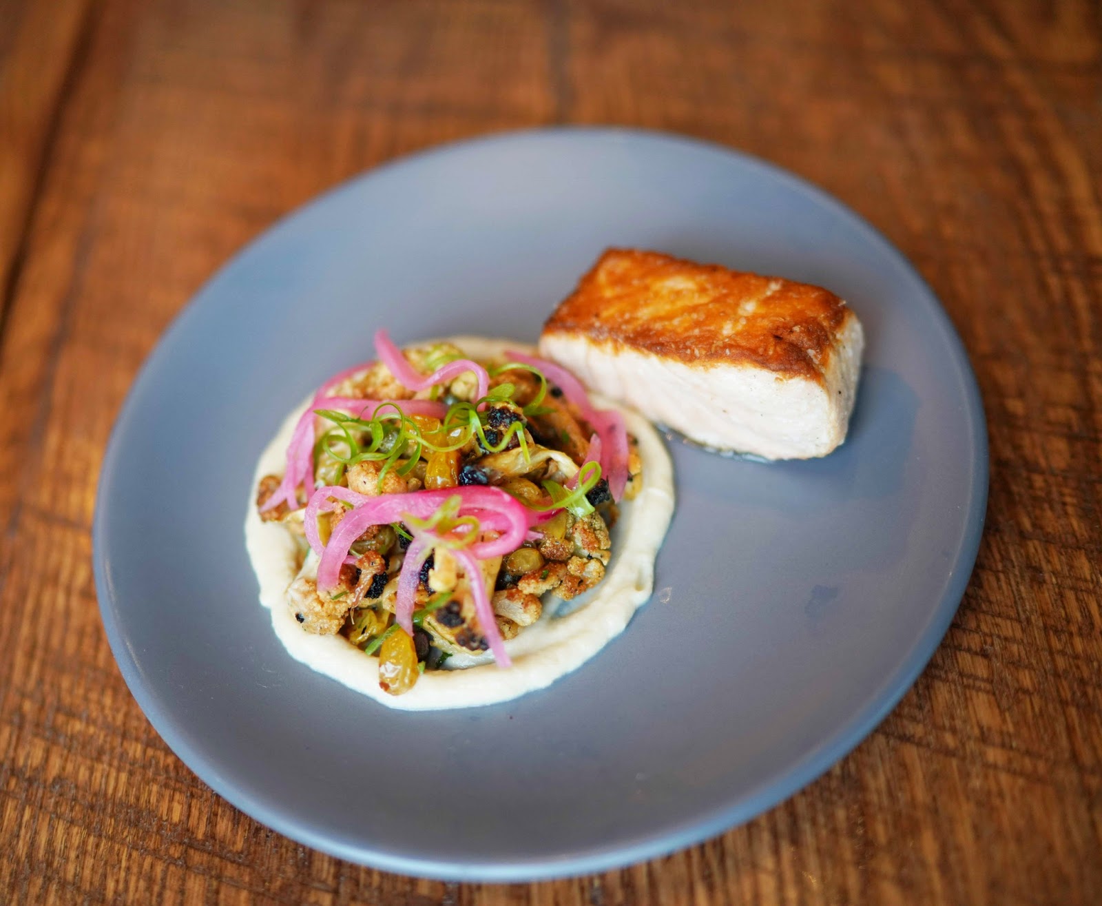 The Seared Salmon with Cauliflower and pickled onions is my favorite dish! The sear on both the salmon and scallops adds phenomenal flavors.