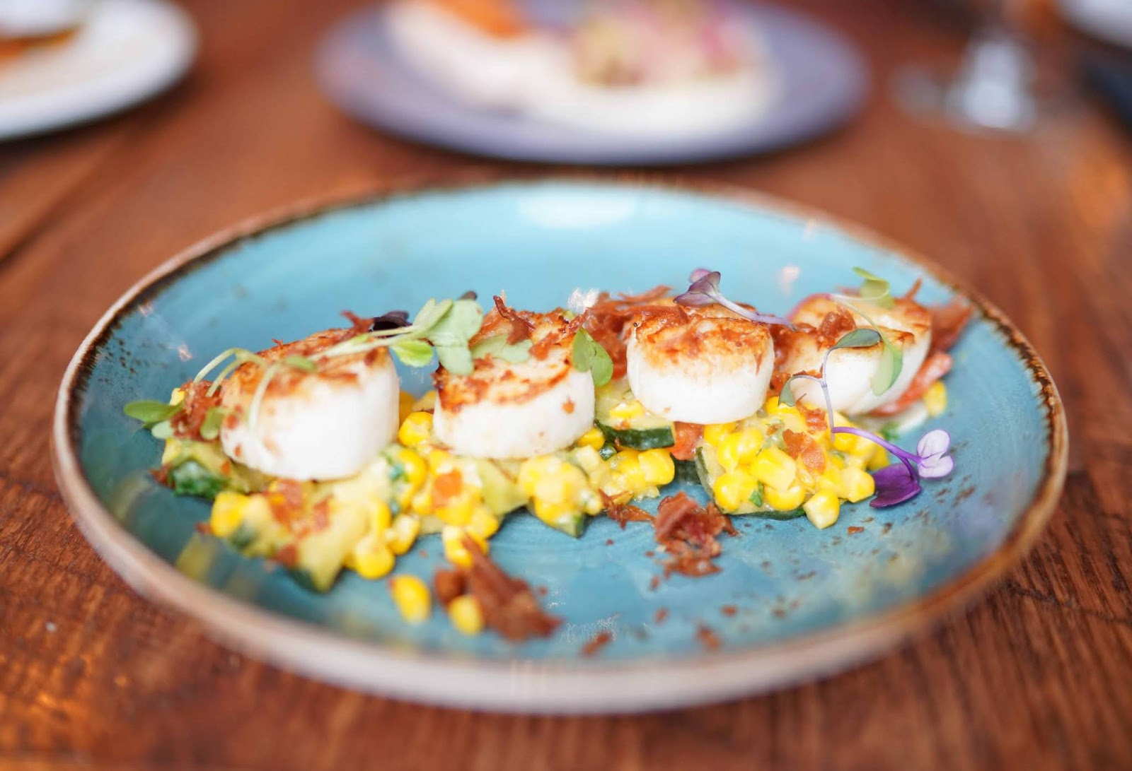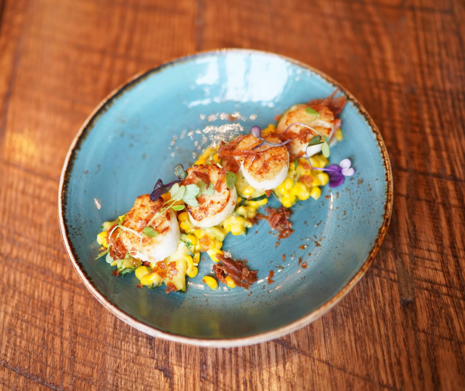 Seared Scallop tapas has 4 scrumptious seared scallops on top a corn medley and topped with crispy prosciutto.