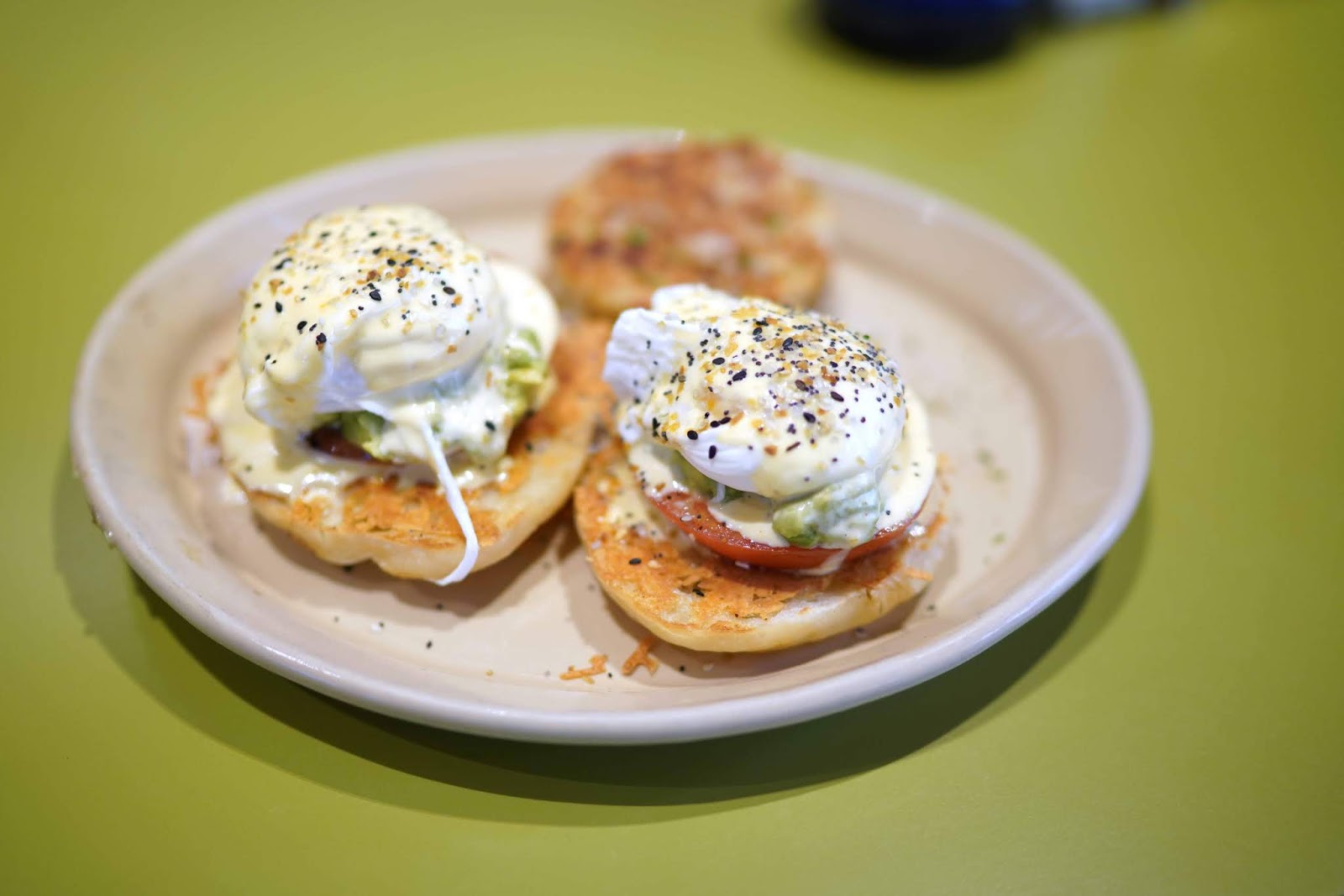 Smashed Avocado Benny: Snooze signature English muffin topped with heaping amount fresh smashed avocado & green chili, parmesan cheese, vine-ripened tomatoes, two poached cage free eggs, smoked cheddar hollandaise and everything spice. This was my favorite dish!