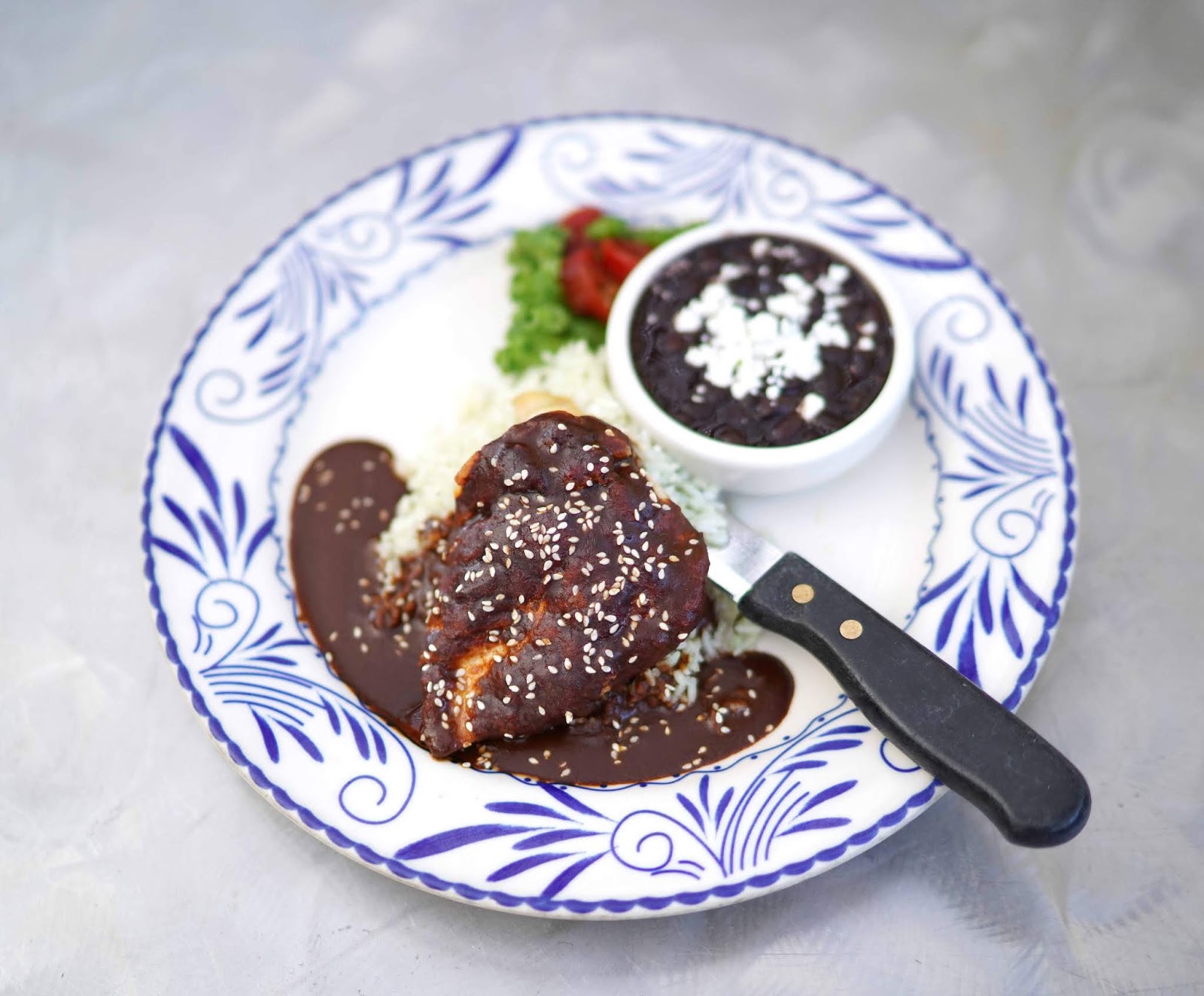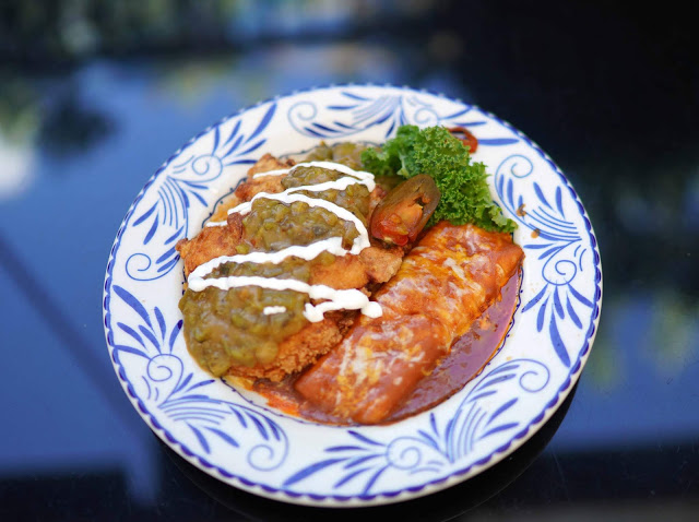 I enjoyed all three dishes but the Chicken Breast with Enchiladas ($11.99) was my absolute favorite. This dish has a lightly fried chicken breast topped with savory green chili sauce, queso and sour cream and plated with the most perfect hand rolled cheese enchilada covered in Colorado on top a bed of Mexican rice and a side of their famous charro beans.