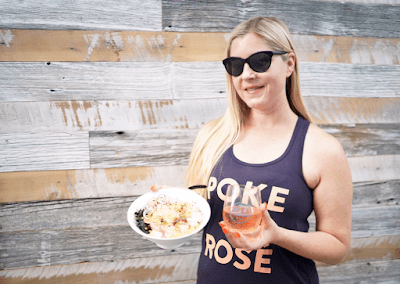 I am completely charmed by their exceptional team, easy to order kiosk system, gorgeous picture-perfect dining room & decor, inviting patio and delectable bowls. The kitchen is so versatile and accommodating. And really, they had me when I walked in the door and saw their adorable \”Poke & Rosé\” shirts, I could not leave without purchasing a tank of my own.