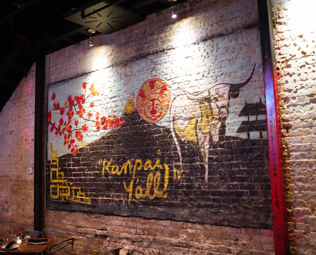 The vibrant restaurant is a mix of an izakaya feel with pop-culture inspired murals. The dining room ceiling is decorated with an army of upside down parasols and a red glow fills the space under the bar. I dined in recently with fellow bloggers and found some new favorite dishes.