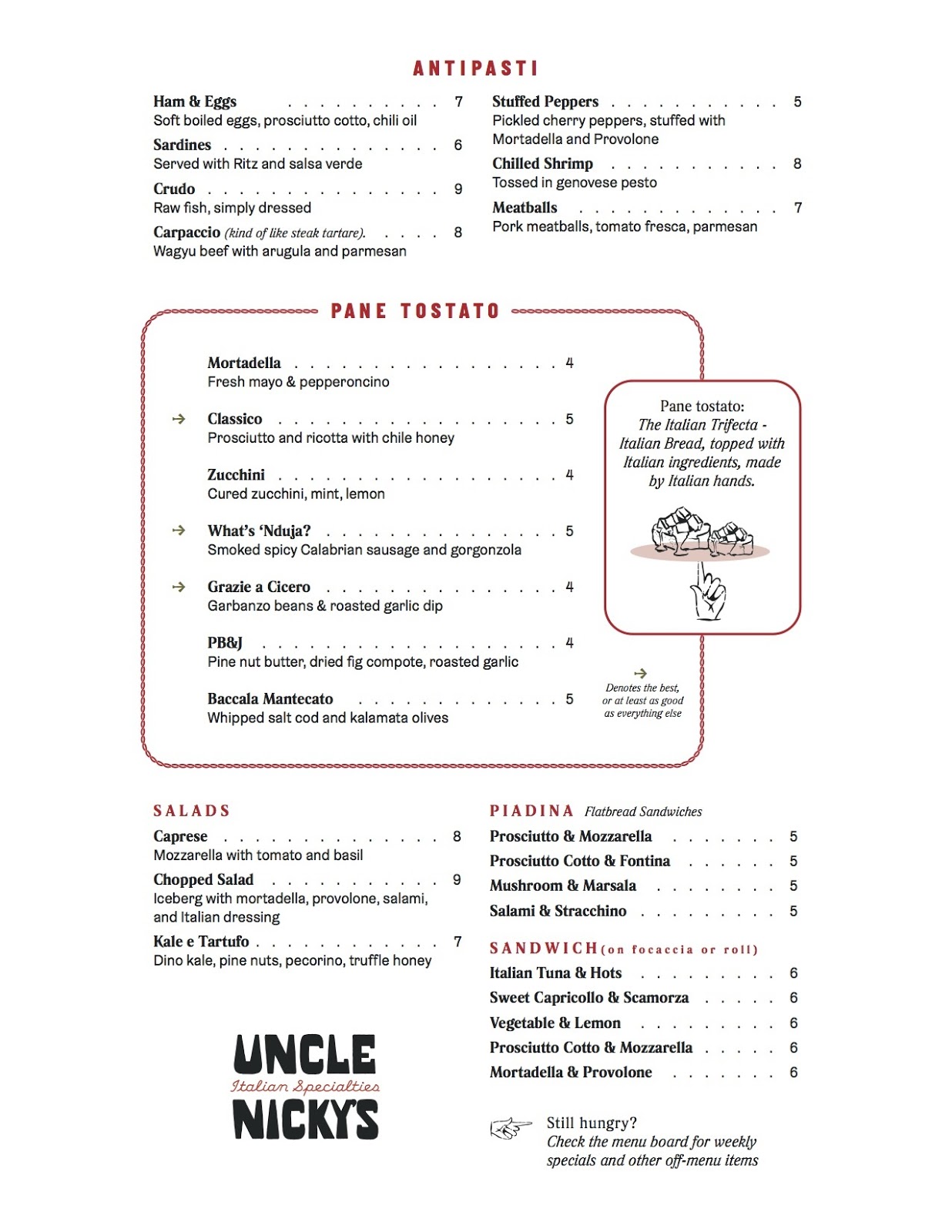 Uncle Nicky’s, a casual Northern Italian cafe, opened February 4th in Hyde Park. The new concept was created by the trifecta Chef Nicholas Yanes, owner and executive chef of Juniper, Brandon Hunt and Zane Hunt of Via 313 and Nickel City, and Nickel City partner Travis Tober. Chef Derrick Flynn helms the pastry program, Nick Intonti, formerly Chef de Tournant at Juniper, heads the cafe as chef and operator and they have partnered with Matthew Bolick of Wright Bros. Brew & Brew, Better Half, and Little Brother Bar on the coffee and espresso offerings.