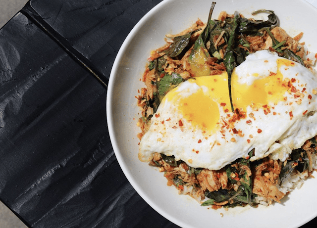 stir fried chicken, caramelized soy sauce, chili vinegar, fried egg