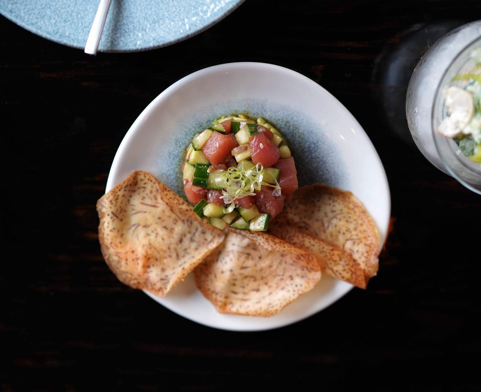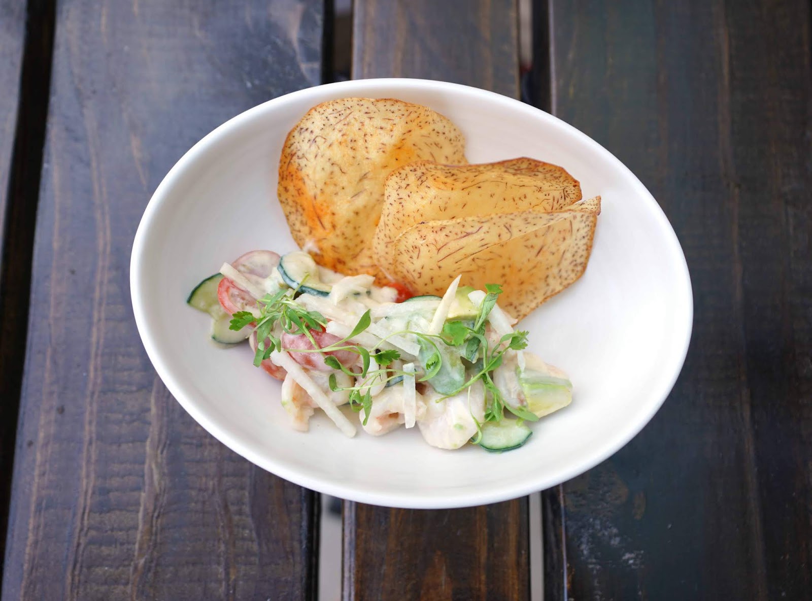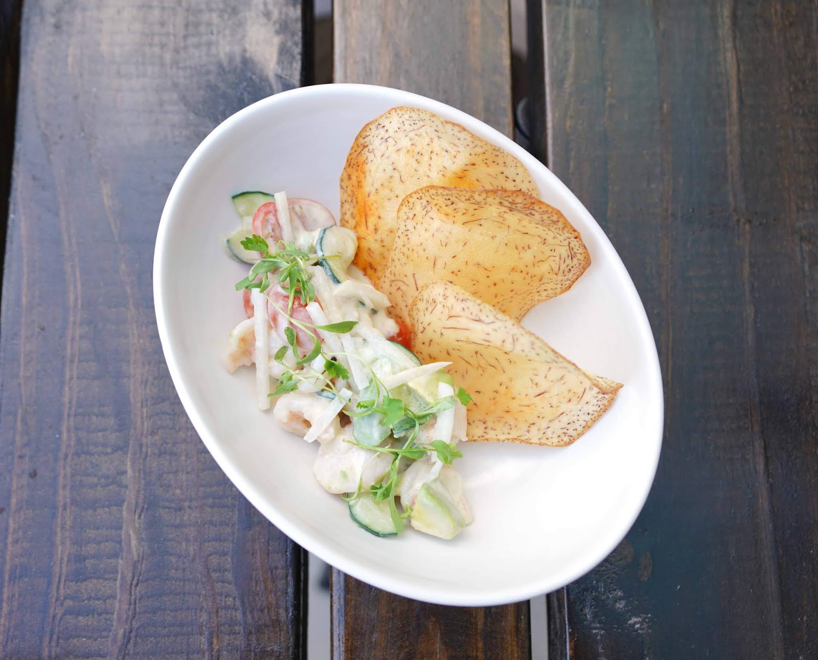Shrimp + Avocado dish is truly the perfect summery bite. The refreshing dish has plump poached shrimp, thinly sliced salt cured cucumber, grape tomato and jicama paired with their house made taro chips.