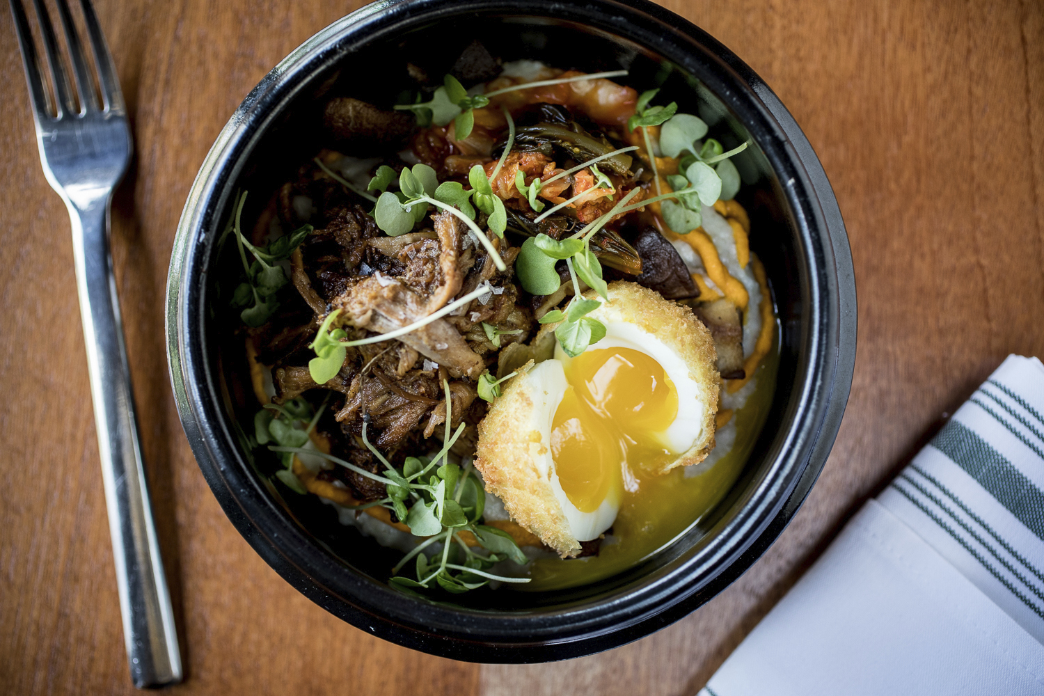 - Sugar-cured pulled pork with a crispy egg + coconut rice grits
