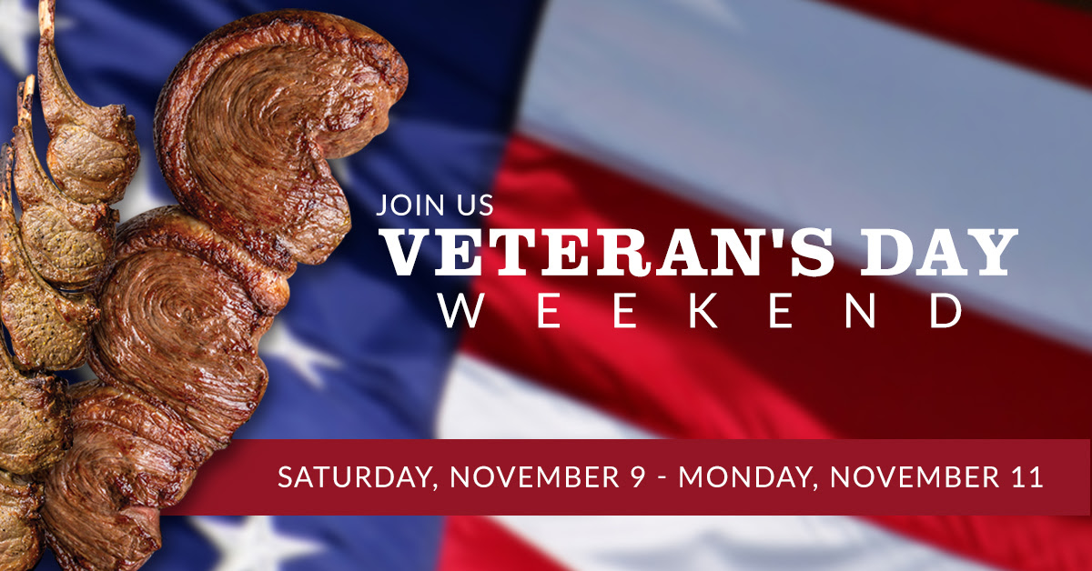 Don\’t forget to join us for a special thank you to military veterans and active-duty personnel this weekend! Saturday, November 9 – Monday, November 11, all veteran and active military personnel with a military ID will receive 50% off lunch or dinner, and up to 4 guests will receive 10% off their meals as well!