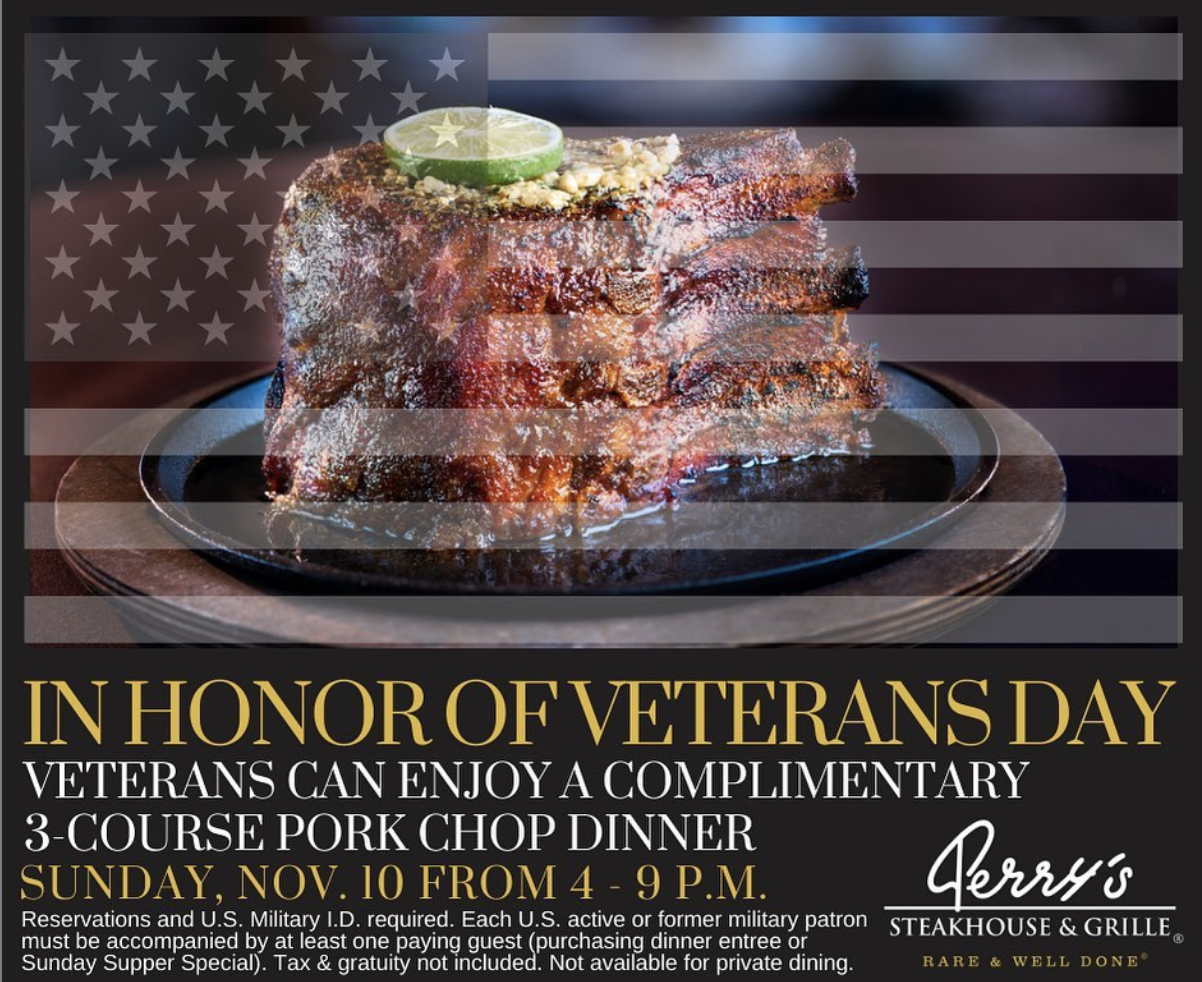 In honor of Veterans Day, we are pleased to offer a complimentary 3-course pork chop dinner to U.S. active military and veterans on this Sunday, Nov. 10 from 4-9 p.m. The dinner features a choice of soup or salad, followed by the legendary, seven-fingers-high, slow-roasted, caramelized pork chop and the decadent dessert trio. Each veteran must be accompanied by at least one guest who purchases an entree or Sunday Supper Special. Reservations and a Military I.D. are required to receive this special offer – make your reservations today!