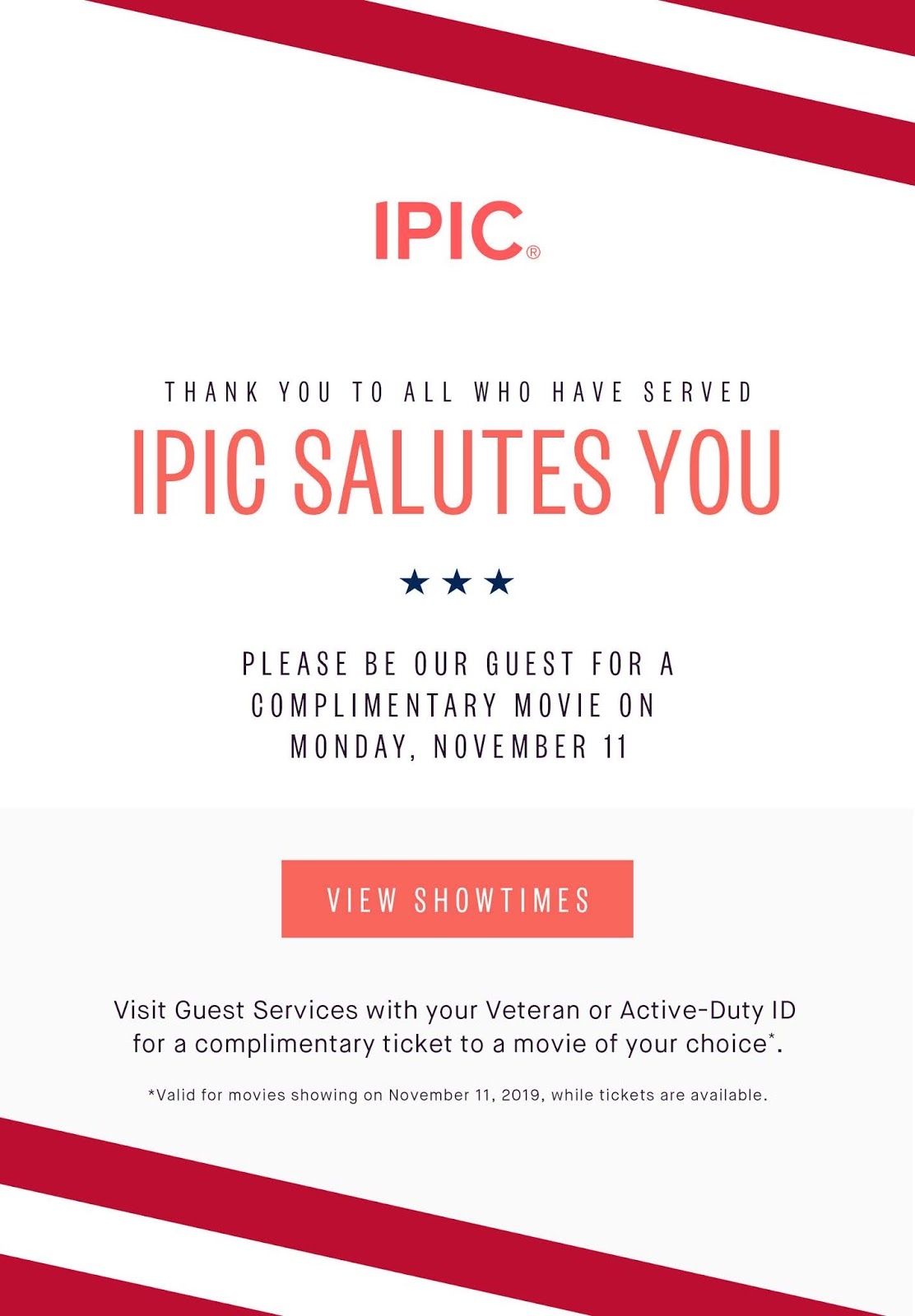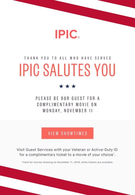 On November 11th Veterans and Active Duty personnel may receive a complimentary ticket to the movie of their choice with their military ID.