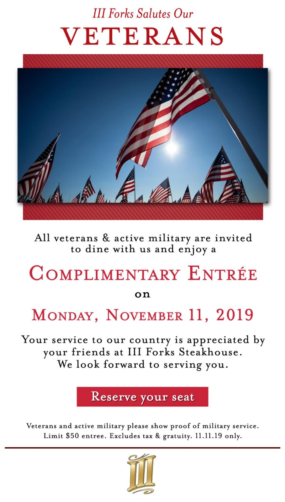 III Forks is one of my favorite places to visit to celebrate Veterans Day! They offer veterans and active duty military a complimentary entree up to $50 with proof of military service. This year they are honoring Veterans and active military on Monday November 11th. I recommend arriving early to enjoy happy hour priced cocktails and the fillet mignon never disappoints. Reservations are recommended.
